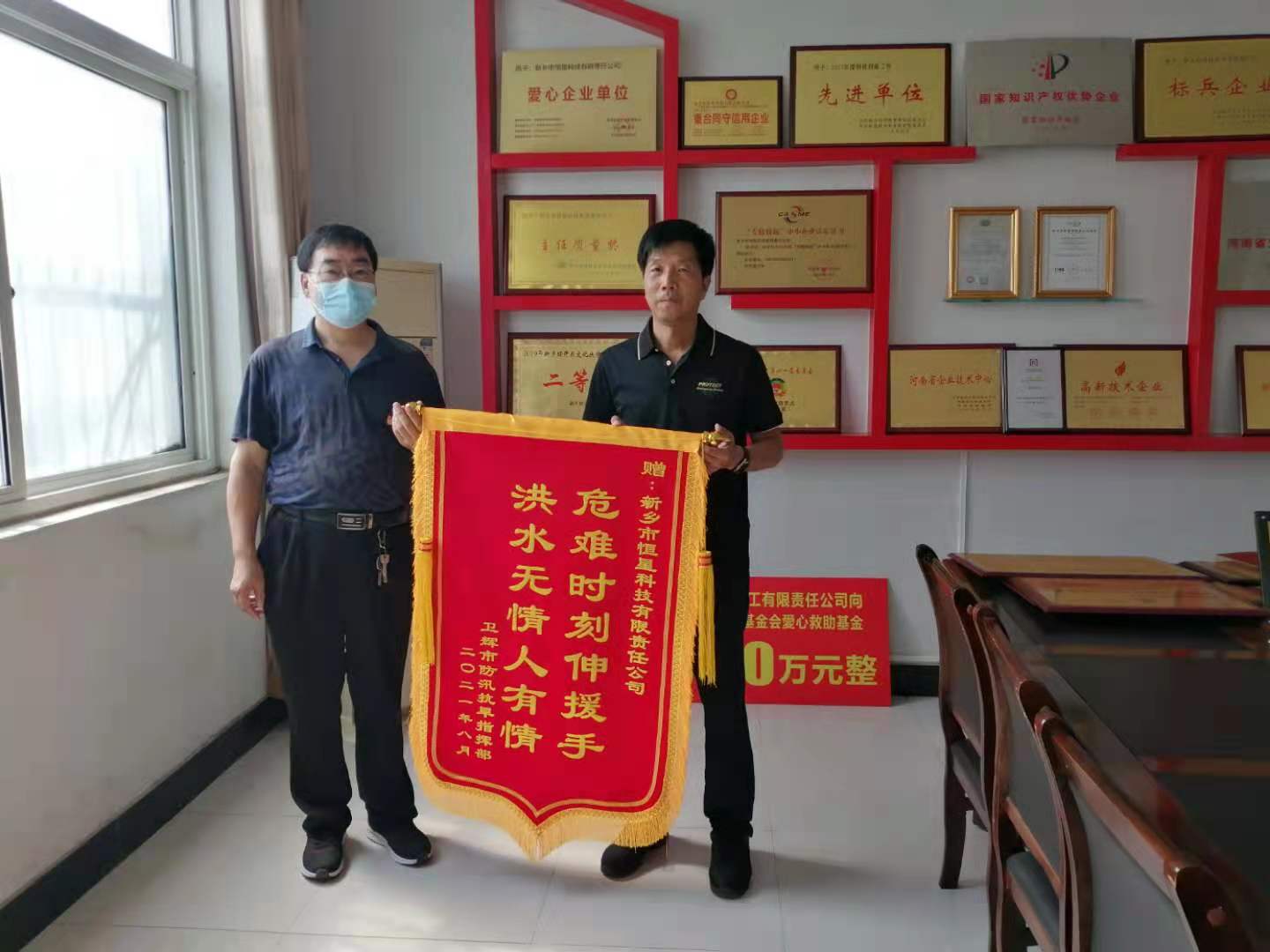 災(zāi)情過后,衛(wèi)輝城市正在逐漸恢復(fù)生機(jī),衛(wèi)輝防汛抗旱指揮部為恒星公司送來(lái)了“危難時(shí)刻伸援手,洪水無(wú)情人有情”的錦旗。